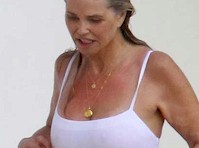 Candids of a wet Christie Brinkley wearing a white swimsuit with pokies on display!