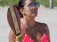 Bikini candids of Eva Longoria in a pink bikini at the beach in Miami! I kinda wanna smack her bum with that paddle.