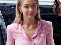 Candids of Gigi Hadid dressed in pink from top to bottom while getting out of a car in NYC! The blouse is slightly see through.