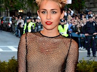 | Miley Cyrus wore a tight fitting dress who sort of works like a see through optical illusion. She needs to stop with the hair.