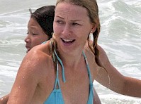 | Naomi Watts may not be wearing the most flattering of swimsuits in these candids but she still looks great while running into the water.