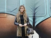 Pics of cute model Nina Agdal posing next to a giant picture of her ass!