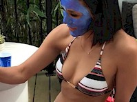 | Nina Dobrev’s face is blue in these pics but no, its not sympathy for blue balls but rather some skin treatment she’s doing! She’s also in a bikini.