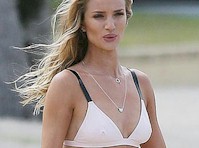 Behind the scenes pics of Rosie Huntington-Whiteley wearing a bikini at a shoot for Modelco.