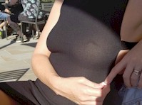 Great shot of a braless girl sitting in the sun. I wonder if she knows the sunshine is turning her dress see through?