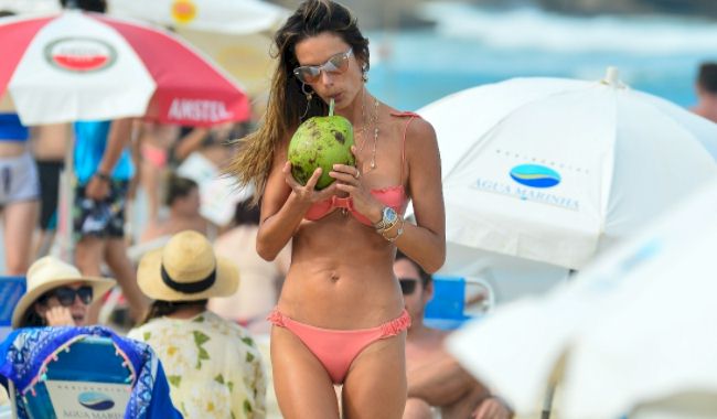 Candids of Alessandra Ambrosio wearing a pink bikini while enjoying a coconut at the beach in Florianópolis! Can see some slight pokies, a hint of pussy mound and some under boob while she’s sitting down!