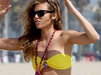 Candids of Annalynne McCord in a yellow bikini at the beach.