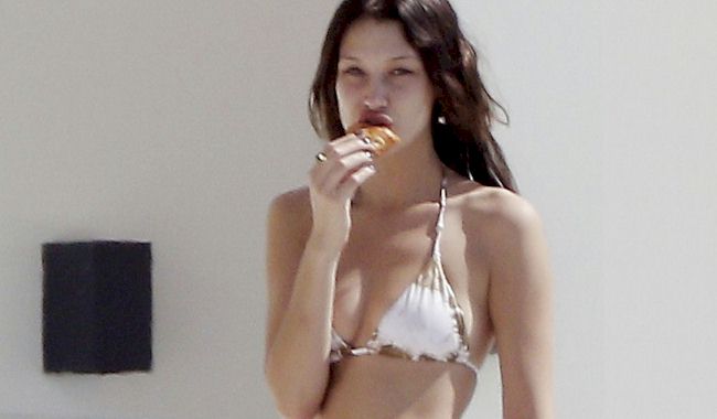 Great bikini candids of Bella Hadid on vacation in St Barts! She eats a croissant, she gets a glass of water poured on her, she squats and she spreads her legs!