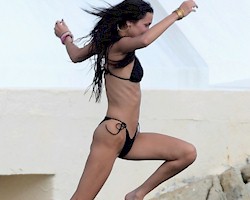 Candids of Bella Hadid looking hot in a black bikini while jumping off Eden Roc in Antibes, France!