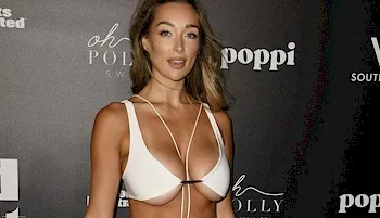 Grace Boor models a bikini (and her boobs) at the beach for Fashion Nova!