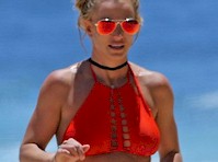 Roundup of Britney Spears in a red bikini and Hilary Duff in a striped bikini. Think Britney wins this one.