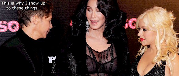 I was so distracted by Christina Aguilera’s cleavage that I almost missed the very sheer Cher which I should share with you on this fine morning! The pics are from the premiere of Burlesque in Madrid the other day and considering the lukewarm reception the movie received in North America I guess Cher thought that maybe her nips would give it a boost in Europe.