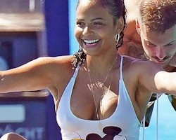 Candids of Christina Milian getting wet in a white swimsuit which makes it slightly see through!