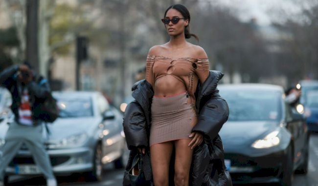 Here’s a braless Cindy Bruna showing plenty of midriff and legs along with pokies while attending the Elie Saab Womenswear Fall/Winter 2022/2023 Show in Paris!