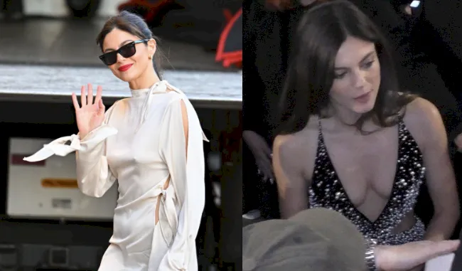 Candid pictures of a braless Kaia Gerber showing cleavage and nipple pokies while stepping into a boat outside Hotel Excelsior in Venice!
