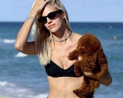 Candids of model Devon Windsor looking great in a black bikini while hanging out with her dog at the beach in Miami!