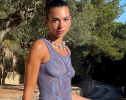 Dua Lipa continues to wear see through clothes on Instagram! Here is her latest set of photos and she’s going braless in a blue dress this time.