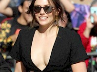 Elizabeth Olsen showed plenty of braless cleavage in a black dress while arriving to Jimmy Kimmel Live in Hollywood!