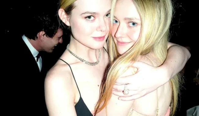 Elle Fanning with a nice nipple slip while she’s hugging her sister Dakota Fanning at Vas Morgan And Michael Brown’s 2024 Golden Globe Party in LA!