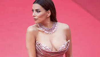 Eva Longoria wearing a loose dress and showing terrific cleavage at the red carpet premiere of The Phoenician Scheme at the 78th Cannes Film Festival!