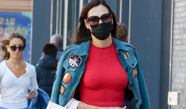 Candids of Famke Janssen wearing a mask and showing pokies while walking around in NYC! View the pictures