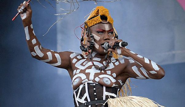 Grace Jones Topless in Nipple Paint! June 11, 2015 | Published in Categories Grace Jones Here’s Grace Jones performing live on stage and she’s putting on one helluva show! High-res via Imagevenue: