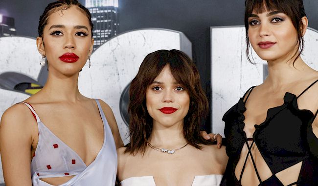 Actress Jasmin Savoy Brown showing nipple in a see through bra while walking the red carpet with Jenna Ortega and Melissa Barrera at the world premiere of Scream VI!