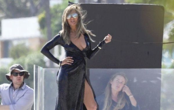 Behind the scenes candids of Jennifer Aniston showing a ton of cleavage on the set of a photo shoot in Malibu!
