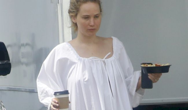 Behind the scenes candids of Jennifer Lawrence grabbing lunch, and showing nipple pokies in a very unsexy gown, while on the set of Red, White and Water in New Orleans!