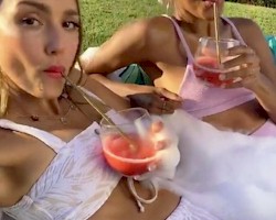 Nice selfie GIF of Jessica Alba wearing a bikini and enjoying a drink!