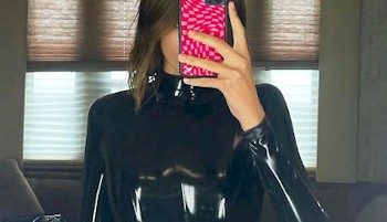 Kaia Gerber shared a few selfies of herself in a skin tight vinyl catsuit! She definitely has the body to pull this off!