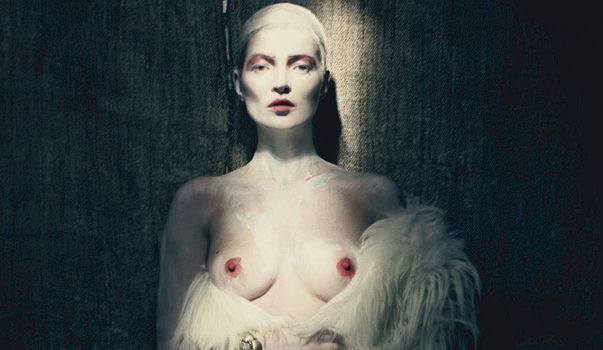 Kate Moss is topless in this brand new and kinda creepy shoot for W magazine! Not sure if she’s supposed to be a painting or a ghost or what?