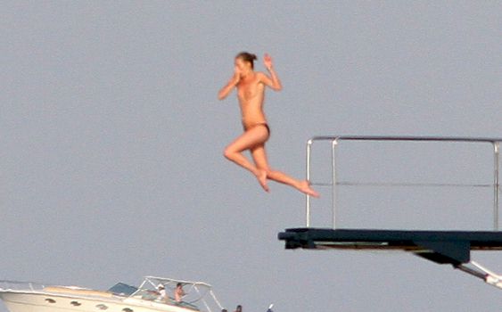 There is no way Kate Moss would let Heidi Klum get all the summer topless glory! Here are some new candids of Kate jumping off a yacht (where else?) topless. Looks like fun times!