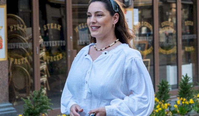 Candids of Kelly Brook looking busty and sexy while showing cleavage in a summer dress!