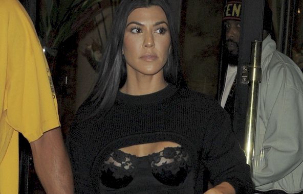 Candids of Kourtney Kardashian wearing a very weird sweater and a corset top while out and about in Paris! Can see her nips through the corset!