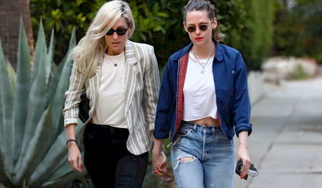 Candids of Kristen Stewart with nipple pokies in a t-shirt and holding hands with her girlfriend Dylan Meyer while on a walk in LA!