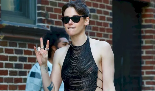 Candid picture of Kristen Stewart showing nipple in a see through top as she arrives for an appearance at The Late Show with Stephen Colbert