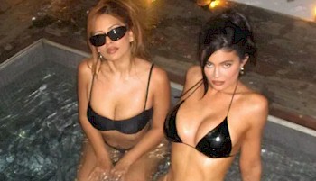Kylie Jenner looking good in a black bikini while going for a dip in the pool while on vacation in Aspen!