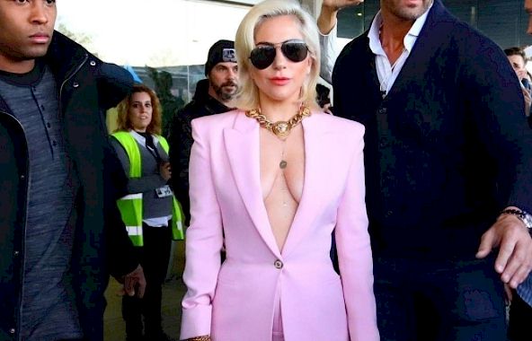 Candids of Lady Gaga arriving at the airport in Barcelona and showing off her flapjacks by wearing a pink suit and nothing else! Comes close to a nip slip when she’s signing autographs but cleavage and sideboob is all we get.