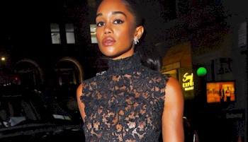Laura Harrier wearing a see through black dress and no bra to the 2023 Vanity Fair Oscar Party! View the pictures