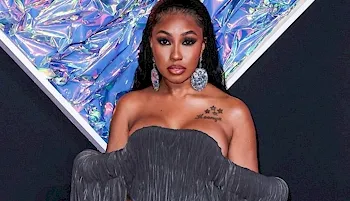 Ice Spice wearing a very tight dress and flashing panties while posing as Betty Boop!