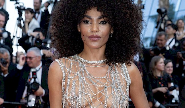 Model Leila Depina wearing a revealing outfit and showing both underwear and nipples at the red carpet premiere of Asteroid City during the Cannes Film Festival!