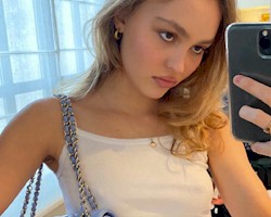 Sexy selfie of a braless Lily-Rose Depp showing off a hand bag or something.
