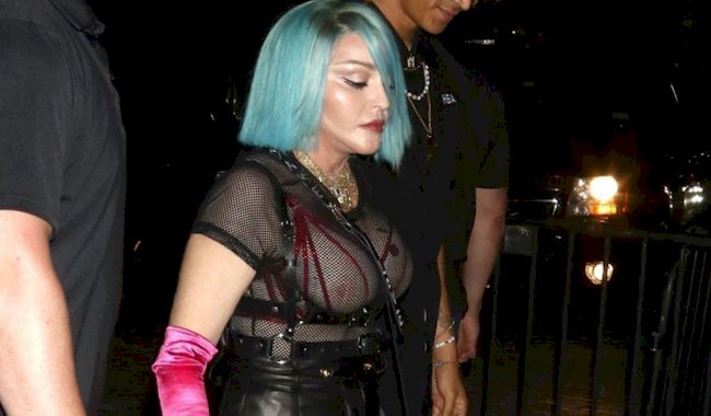 Candids of Madonna looking like a kinky grand ma by wearing a see through top, leather skirt and fishnet stockings while attending a party in NYC! Nice blue hair too… View the pictures