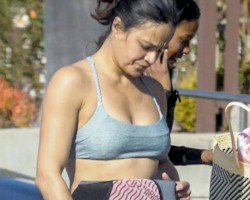 Bikini and wet suit candids of Michelle Rodriguez surfing with friends at the beach in Malibu!
