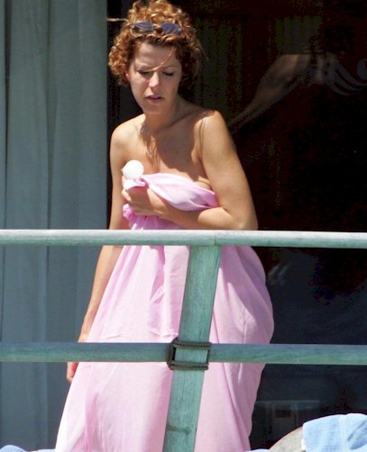 Natasha Kaplinsky is a British newsreader who just got married and these candids are from her honeymoon. NUDE honeymoon apparently. The guy she married found himself a hot bird, thats for sure!