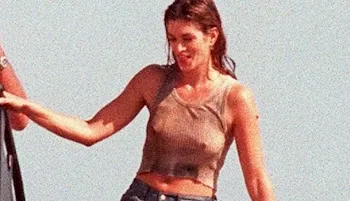 Behind the scenes with Nadine Velazquez showing some underboob and nipple pokies while posing in a top that looks more like a belt!