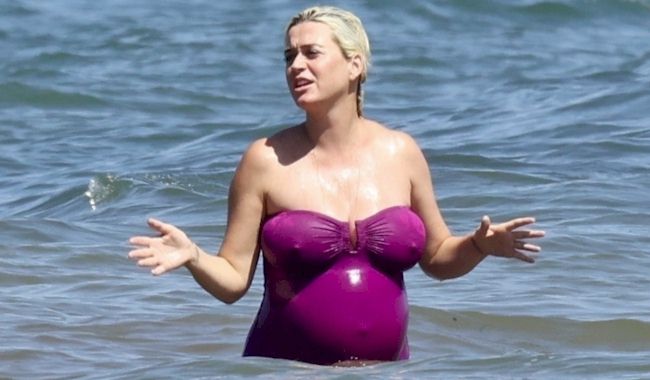 Candids of a very pregnant Katy Perry wearing a purple swimsuit and going for a dip in the ocean at a beach in Malibu!