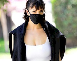 Candids of Rebecca Black filling out a top nicely while walking her dog!
