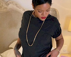 A couple of new outtakes of Rihanna wearing a t-shirt and panties. The panties look semi-sheer so we need higher resolution versions to see if any bits are visible.